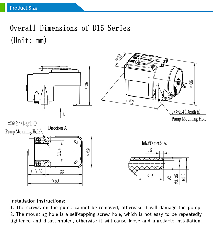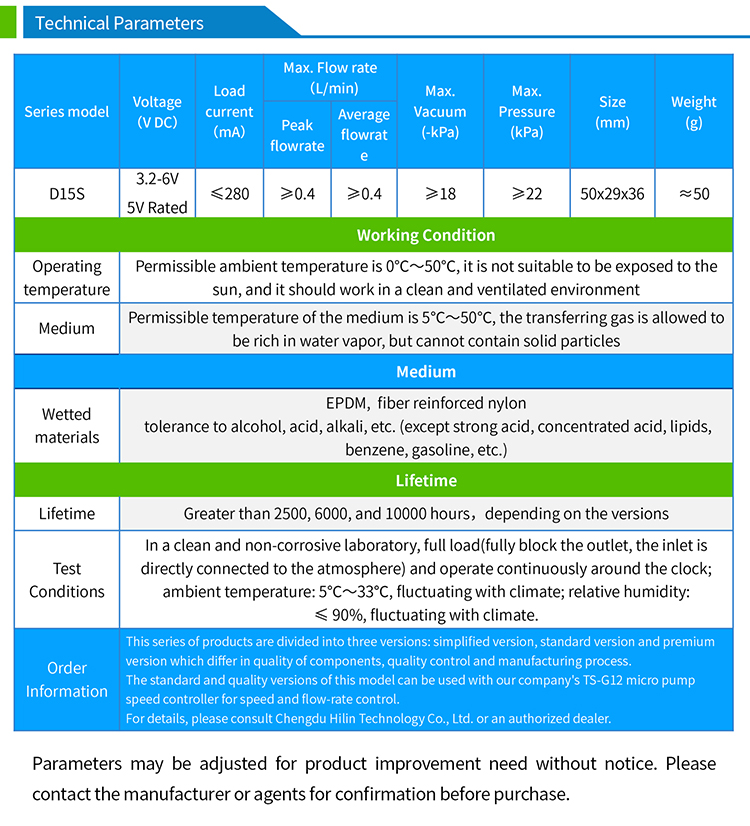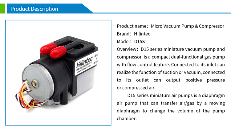 D15 series miniature air pump is a small volume vacuum pump with wide voltage power supply. Connecting to its suction port can perform the function of pumping or vacuuming, and connecting to its exhaust port can achieve the function of blowing or pumping.