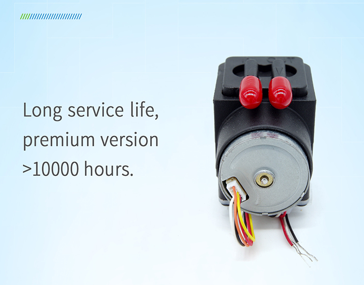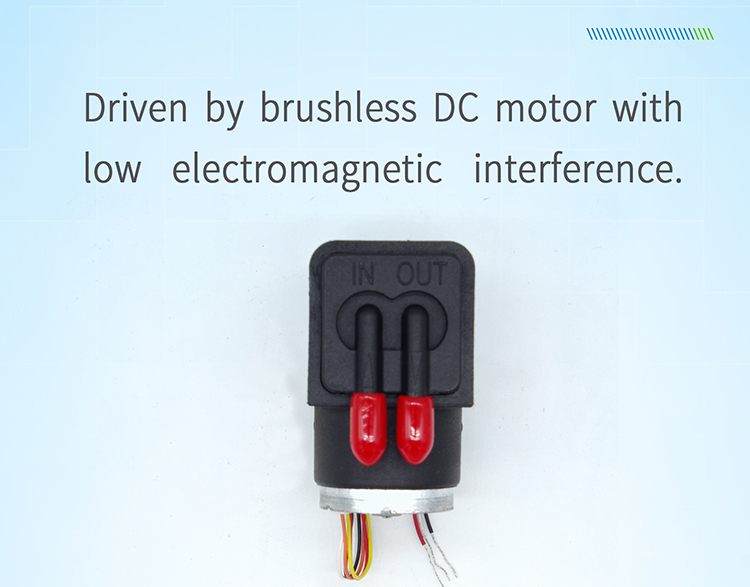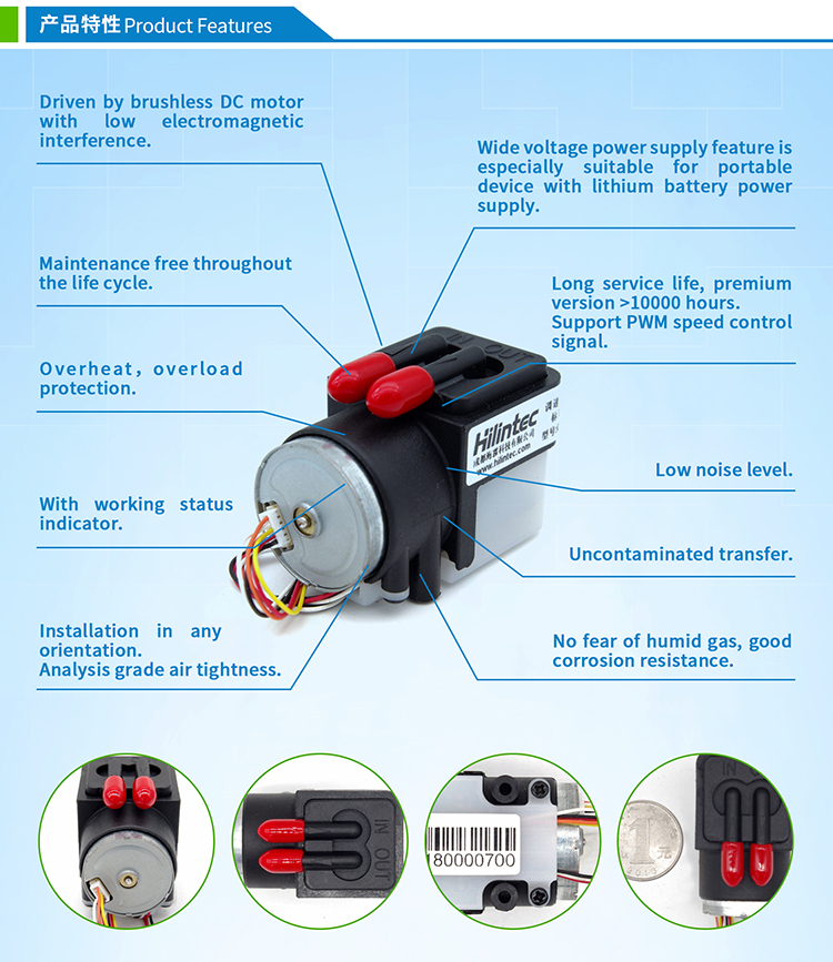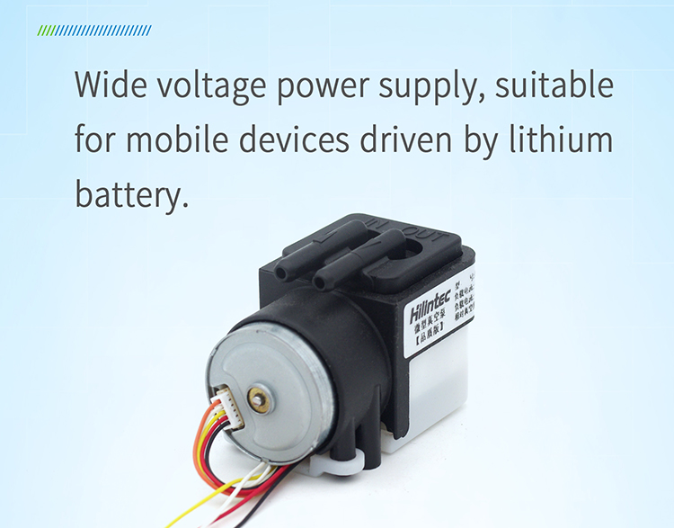 Especially suitable for: very small installation space, scenarios requiring high air tightness, and there is resistance at the exhaust port; especially suitable for portable mobile devices powered by lithium batteries; the pump has high reliability, low noise, and a flow rate of 0.4L /min.
