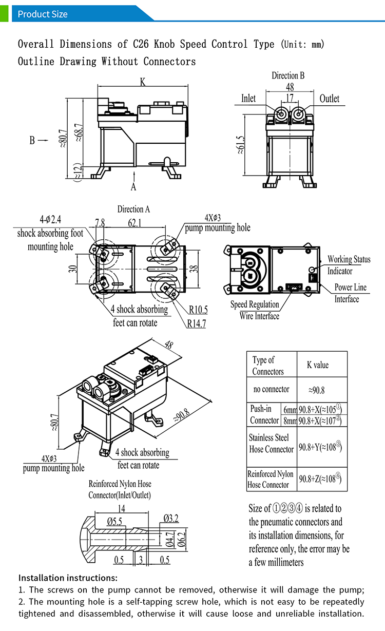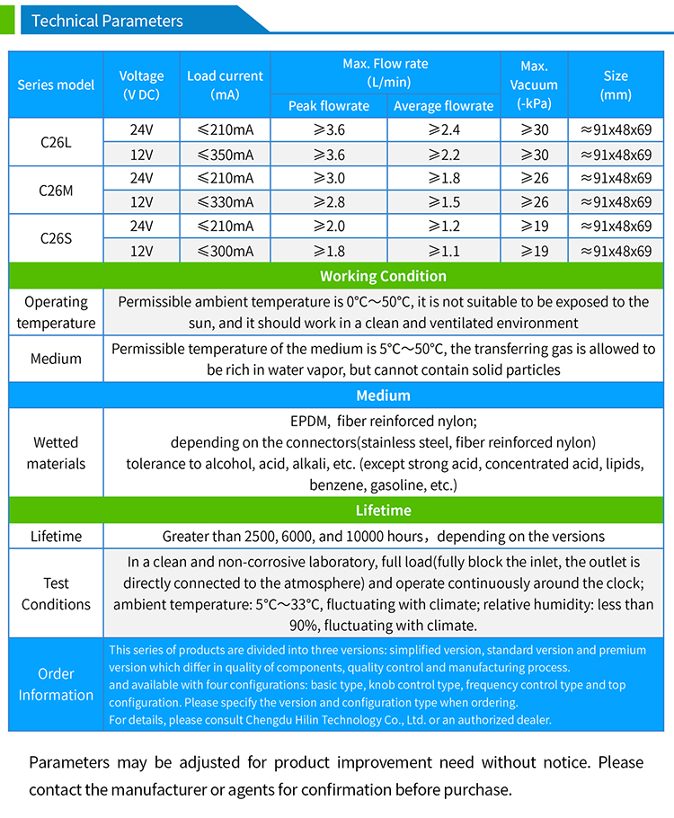 The C26 series miniature air pump is a compact vacuum vacuum pump with integrated speed and flow control function. The suction port connected to it can achieve the function of pumping or vacuuming.