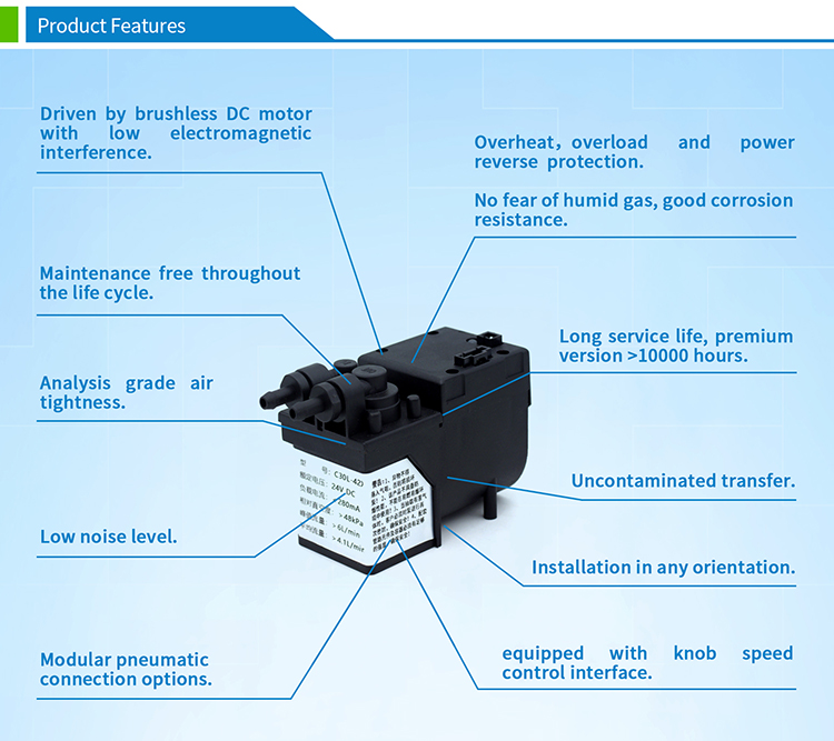 Especially suitable for: gas collection or analysis fields with a flow rate of 4-6L/min and unobstructed exhaust. This model product, with good air tightness and high reliability, is equipped with working condition indicator light and knob speed control interface and a rotary encoder is provided for free.