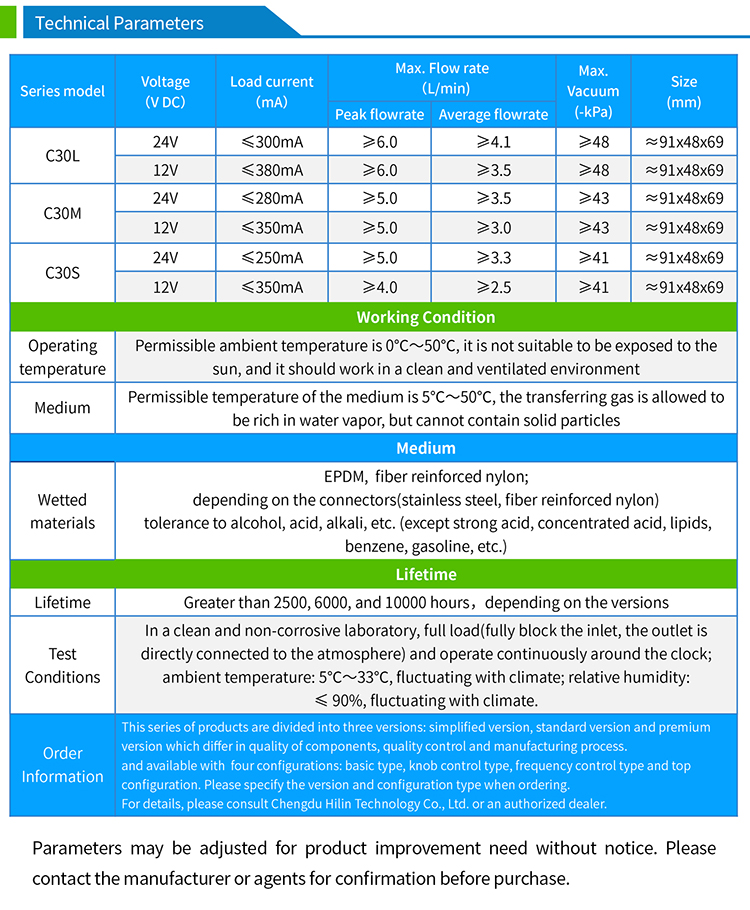 The C30 series miniature air pump is a compact vacuum pump with integrated speed and flow control function. Connecting to its suction port can realize the function of pumping or vacuuming.