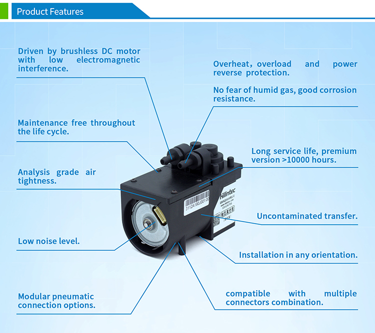 The C30 series miniature air pump is a compact vacuum pump with integrated speed and flow control function. Connecting to its suction port can realize the function of pumping or vacuuming.