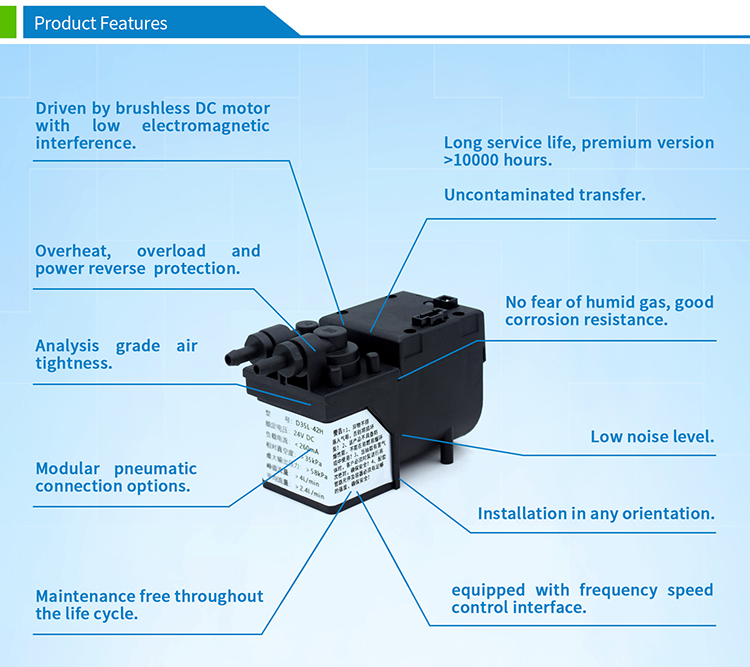 Especially suitable for: gas collection or analysis field with flow rate 2~4L/min and exhaust gas resistance. This model product has a frequency speed control interface, precise speed control, good air tightness and high reliability.