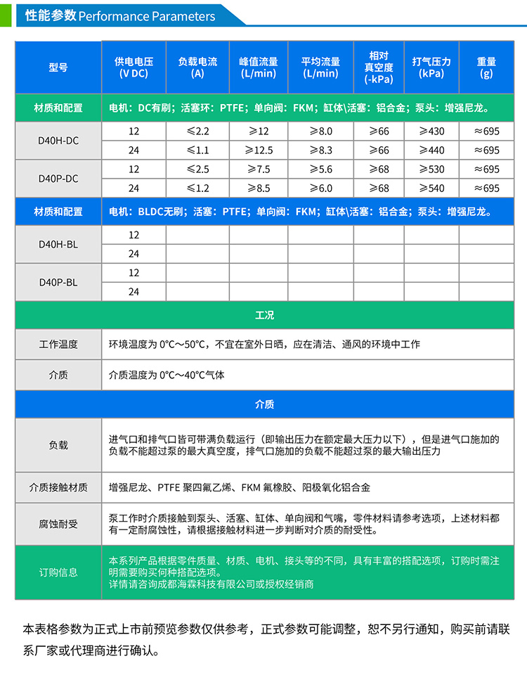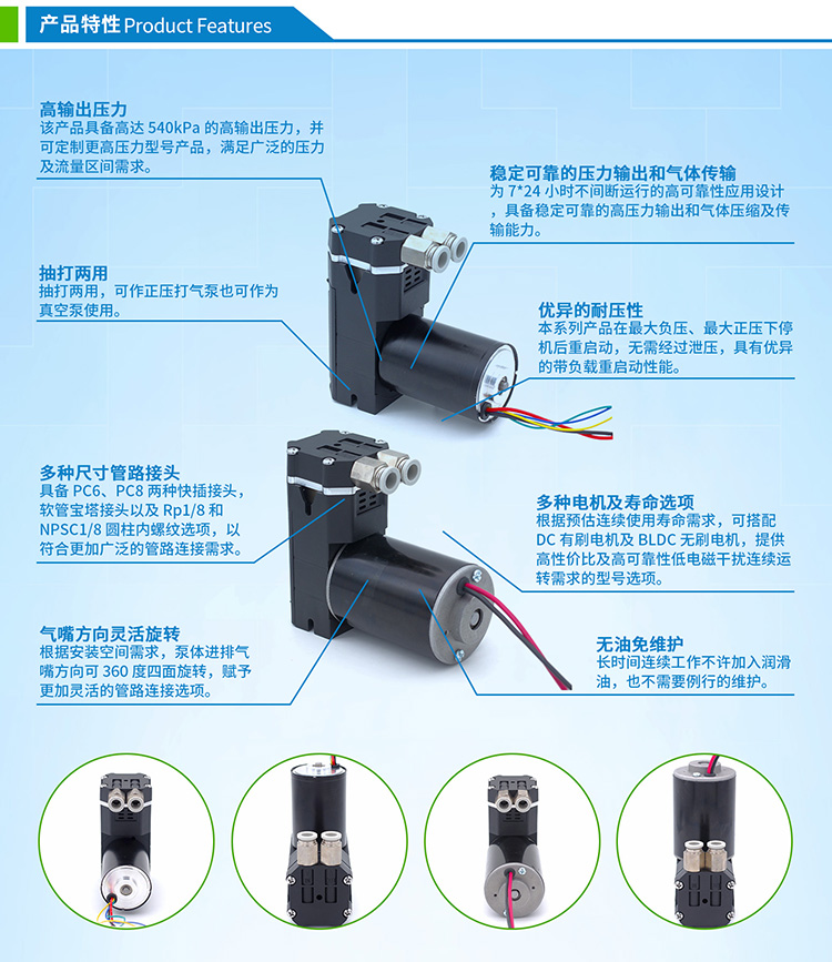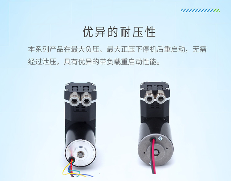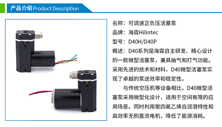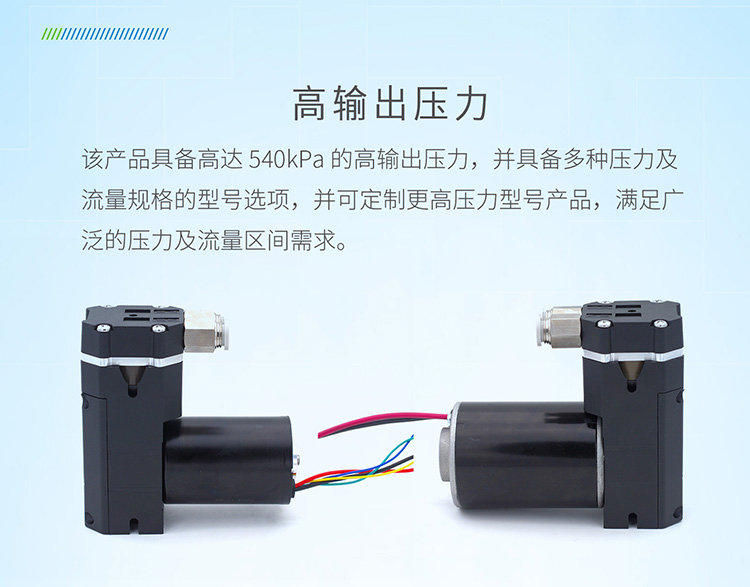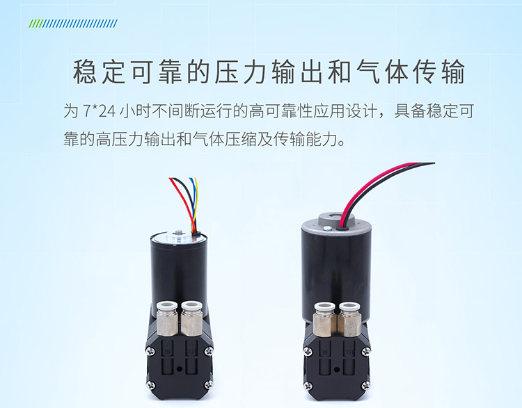 与传统空压机等设备相比,D40微型活塞泵采用微型化设计,适用于空间有限的应用场景。同时利用聚四氟乙烯自润滑特性和高效率无刷直流电机,降低了能源消耗。