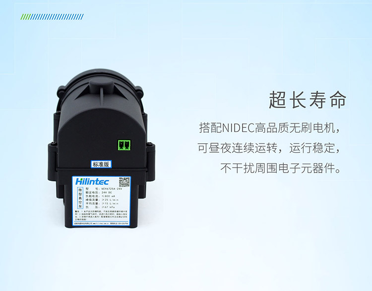 VCY系列微型气泵是一种体积紧凑,直流无刷电机驱动的真空气泵,连接它的抽气口可以实现抽气或抽真空的功能。