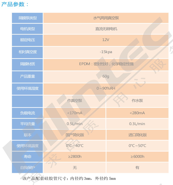 Hilintec品牌下WQY系列目前暂时只有一款产品,即WQY300。这是一款额定电压为12V的直流微型真空水泵,主要功能既可以进行气体输送、又可以抽水,能自吸,可干转,配有直流无刷电机,作为真空泵使用平均流量为0.5L/分钟,作为水泵使用抽纯水空载流量为0.3L/分钟,产品外观如上图,结构小巧精致,可靠美观。详细参数表如下: